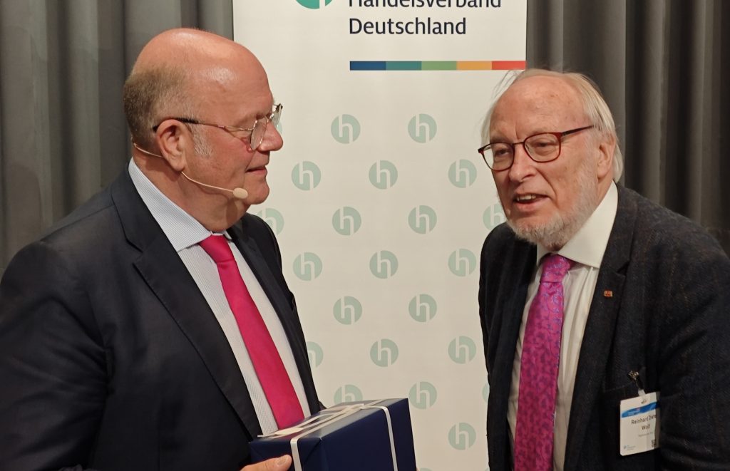 Wolf, Ehrenpräsident des Bundesverband Parfümerien – Handelsverband Kosmetik und des Europäischen Parfümerieverbandes FEPD, wurde nach über 60 Jahren aktiver Verbandstätigkeit als Präsidiumsmitglied des Handelsverband Deutschland verabschiedet. Der HDE-Hauptgeschäftsführer Stefan Genth sprach ihm dabei ebenso großen Dank aus und erinnerte daran, dass er selbst erst durch Wolf den Weg in die Handelsorganisation fand.